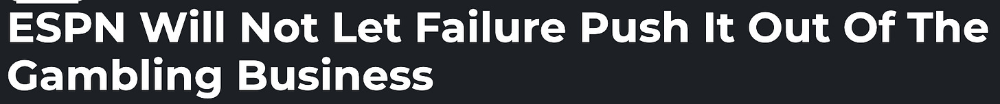 🎰 Not shocked to see ESPN and Penn annul their hasty marriage. That had been in the cards for some time. But ESPN’s not getting out. No sir. They’re getting right back out there, immediately announcing a multi-year deal with DraftKings instead. As Defector put it, in a headline that made me smirk: