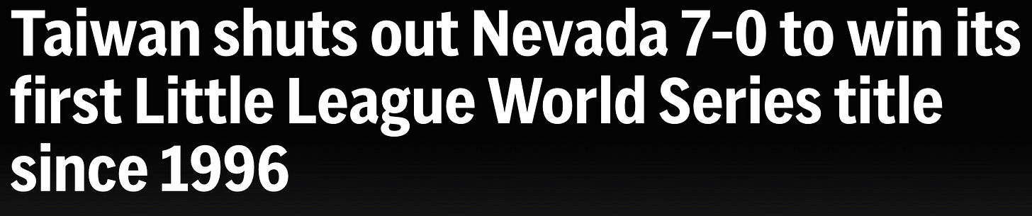 What I did not realize is how historically dominant Taiwan has been at the Little League World Series, which is itself a result, partly, of the Pacific War in the 40s. To see baseball embraced so fanatically in Japan, South Korea, and Taiwan is a strangely cheery relic of an awful and traumatic time for basically everyone involved. It’s complicated — it’s not quite as simple as just, ‘Murica — but it’s also not a coincidence that the same enthusiasm for the sport doesn’t exist in North Korea or China.